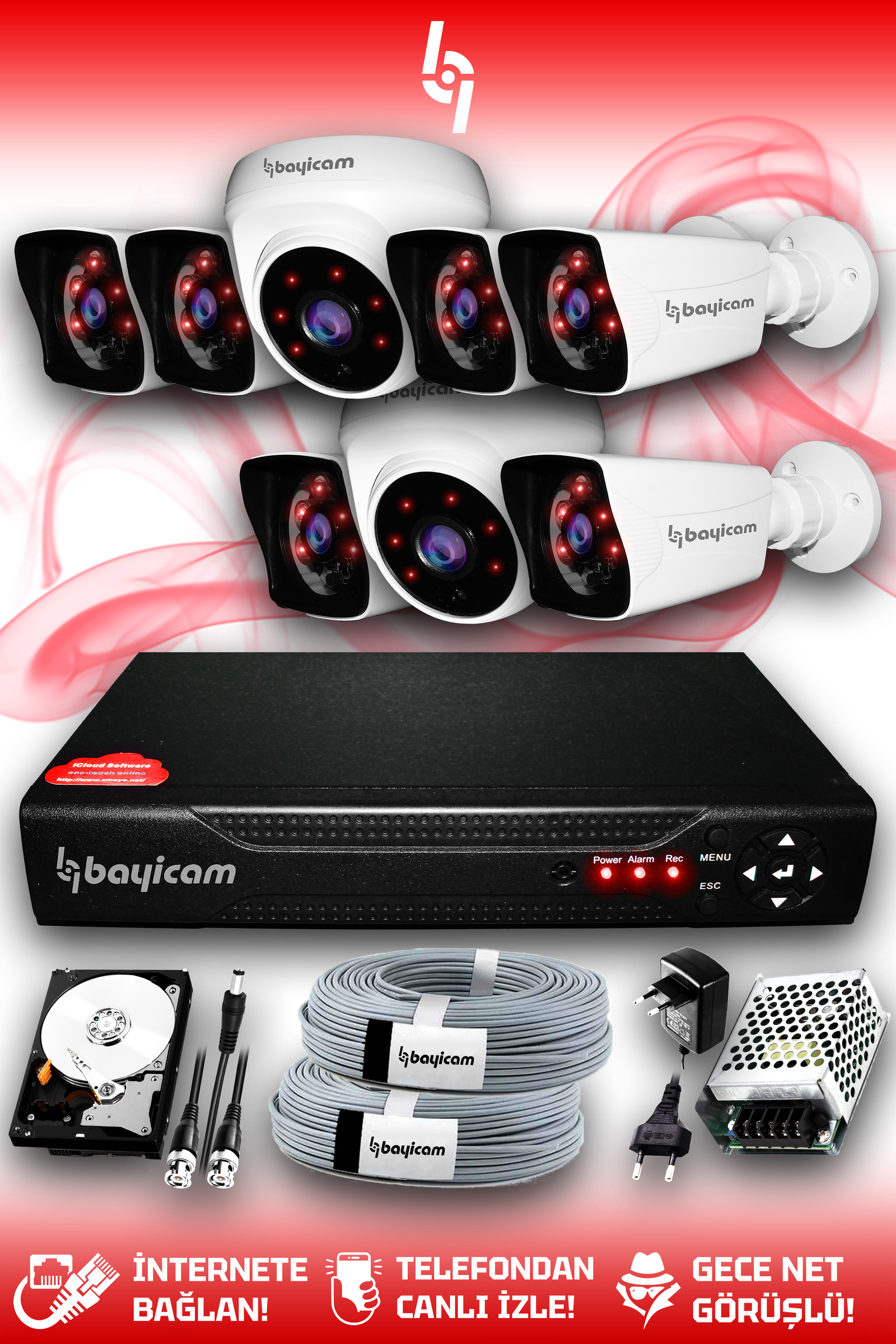8 Full HD Kamera Kare Set 2 TB HDD Dahil 6 Dış 2 İç Mekan Gece Görüşlü Güvenlik Sistemi